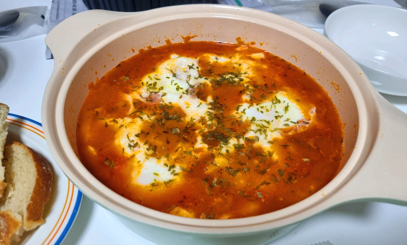 5. 잘 끓인 후에 계란 3알 톡 깨서 넣어주기